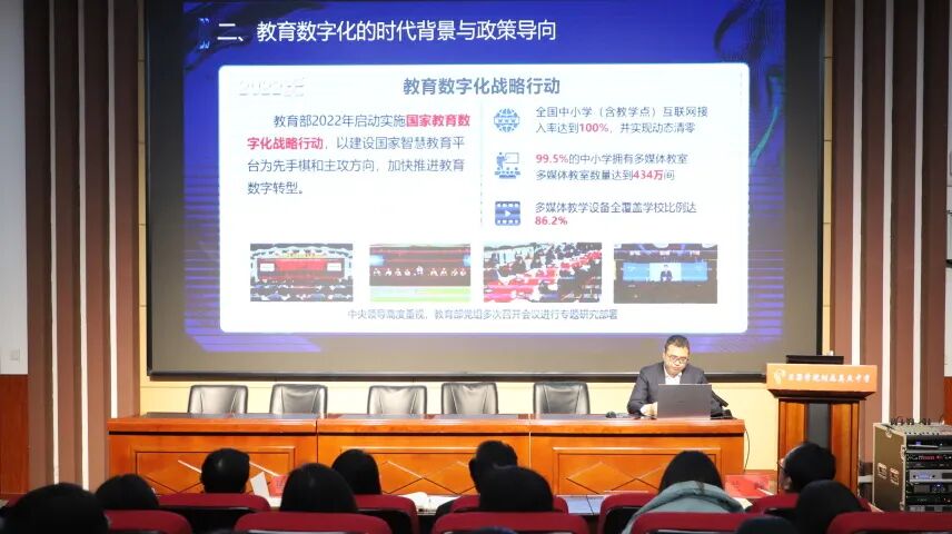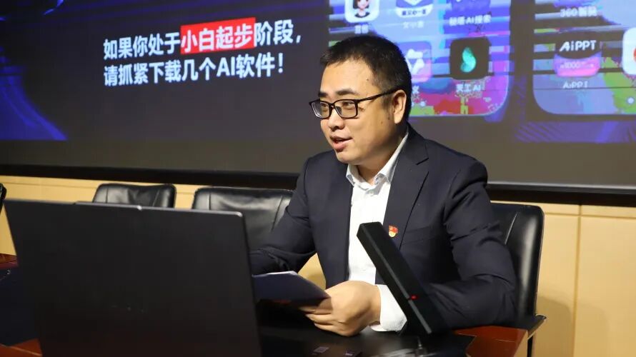 培训现场,崔勤老师以《AI赋能教育变革 开启教育的“智”时代》为主题,围绕AI赋能教育教学核心主题,结合日常教学实际需求,通过理论讲解、案例展示、实操演示、互动问答相结合的方式,深入浅出地讲解了人工智能在备课教研、课堂互动、作业设计、学情分析、班级管理等场景的实用应用。一系列接地气、可操作的AI教学技巧,让老师们直观感受到了AI为教育教学带来的高效与便捷。