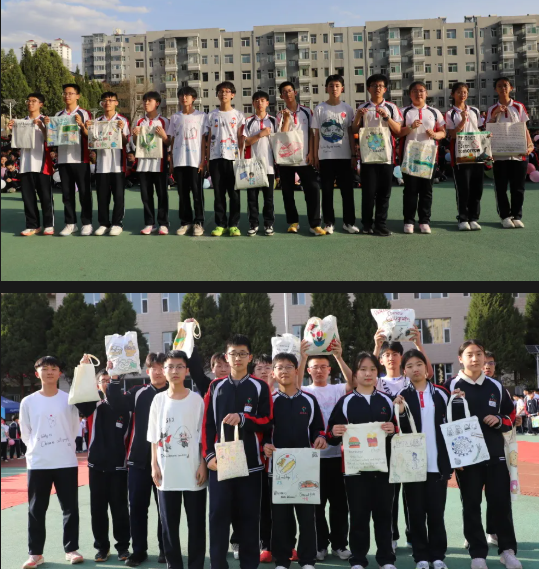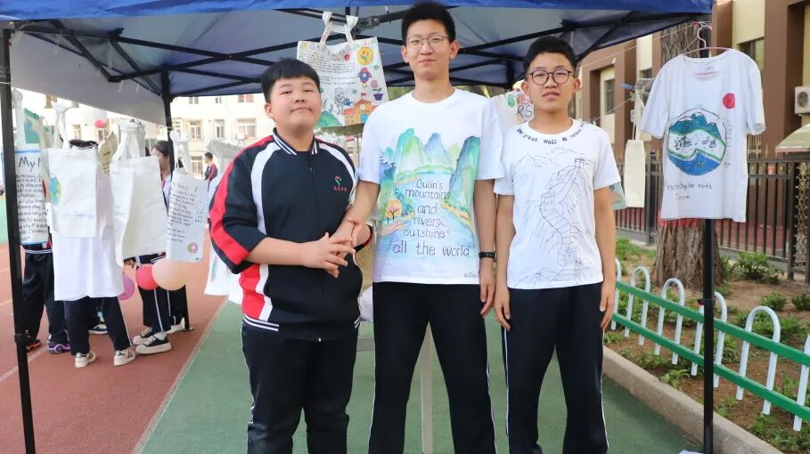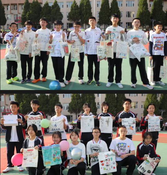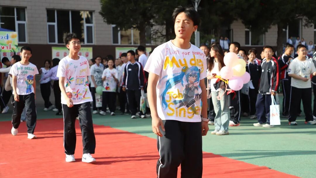 优秀创意T恤作品亮相主题走秀,同学们身着个性作品自信登场,步伐坚定、神采飞扬,并用英文响亮喊出班级口号。