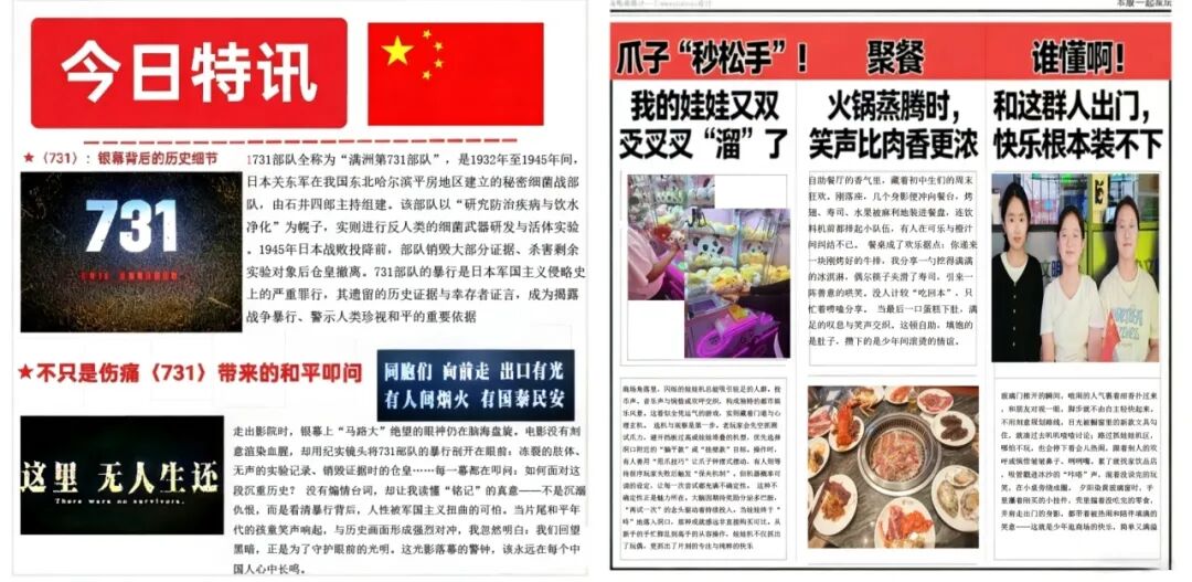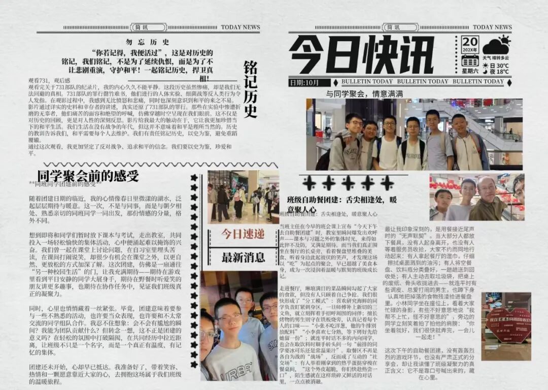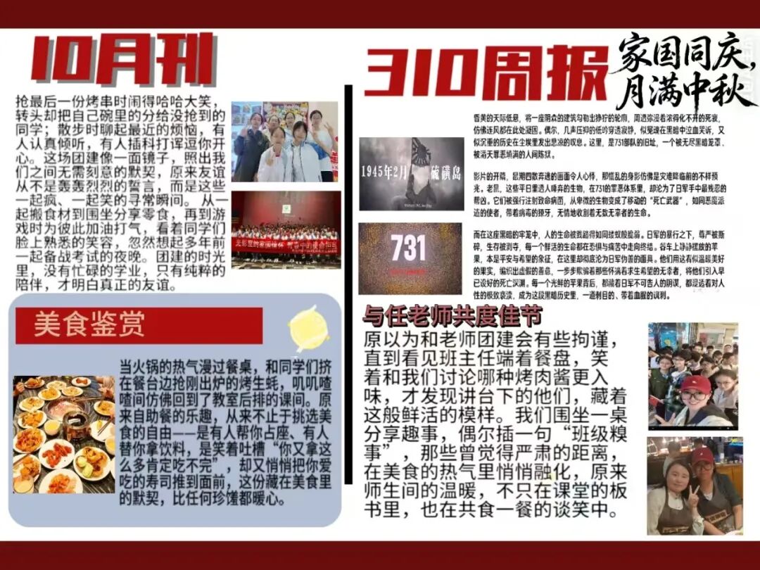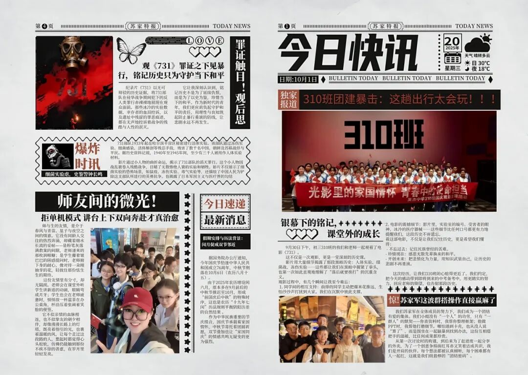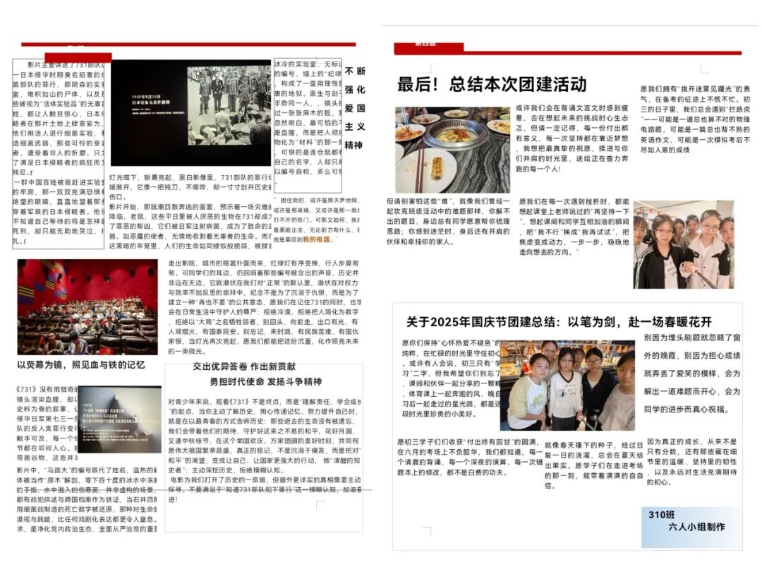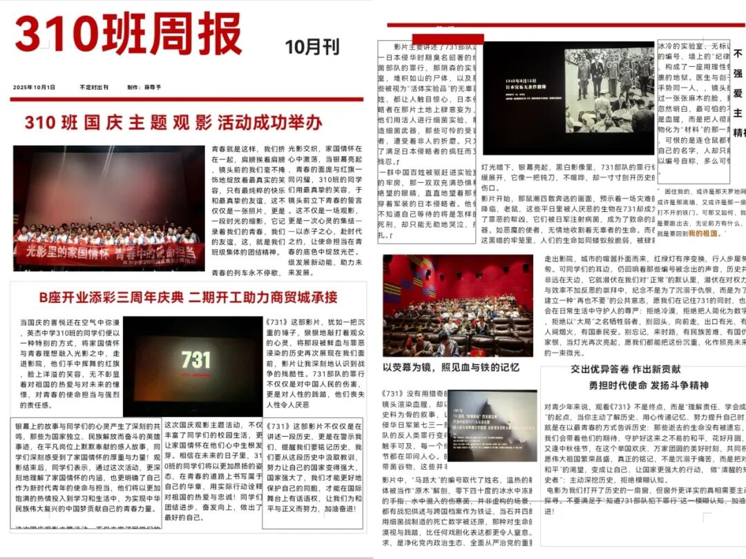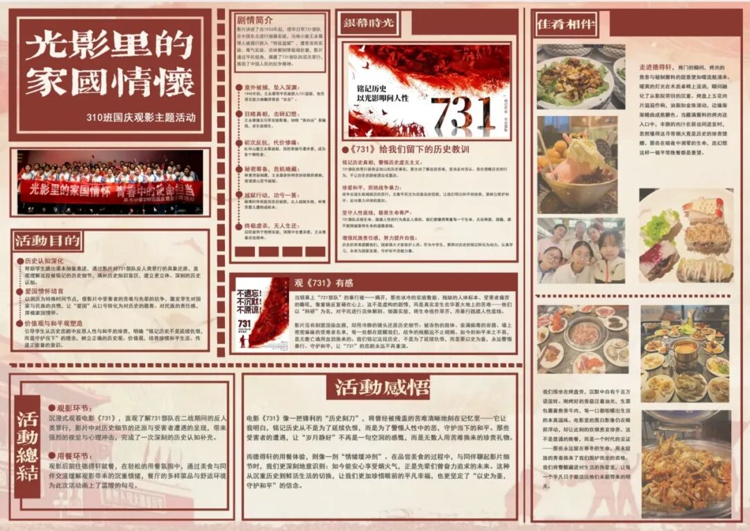 310班全体同学在班主任任洁老师的带领下走进影院,体验了一场特殊的“历史课堂”——共同观看电影《731》。在沉重的历史光影中筑牢家国记忆;后以温馨聚餐延续思考,让感悟在交流中升温;最终,班级50名同学分成6个小组,用笔墨勾勒心中的收获与感动,创作出6份风格迥异、特色鲜明的主题报纸,让“铭记”与“传承”跃然纸上。