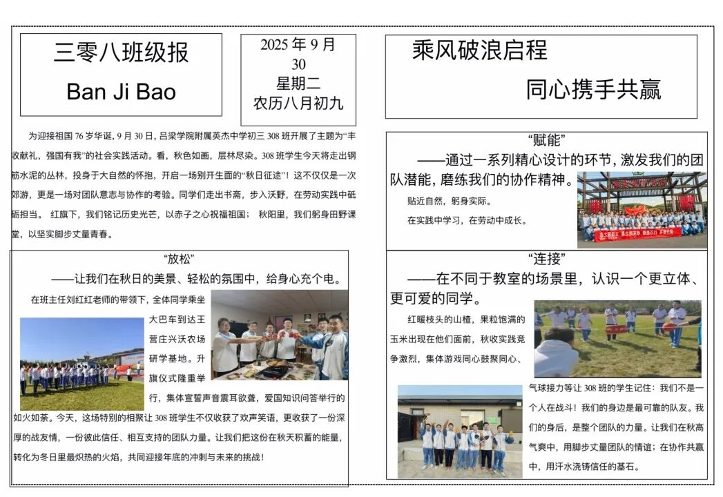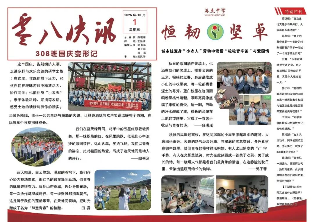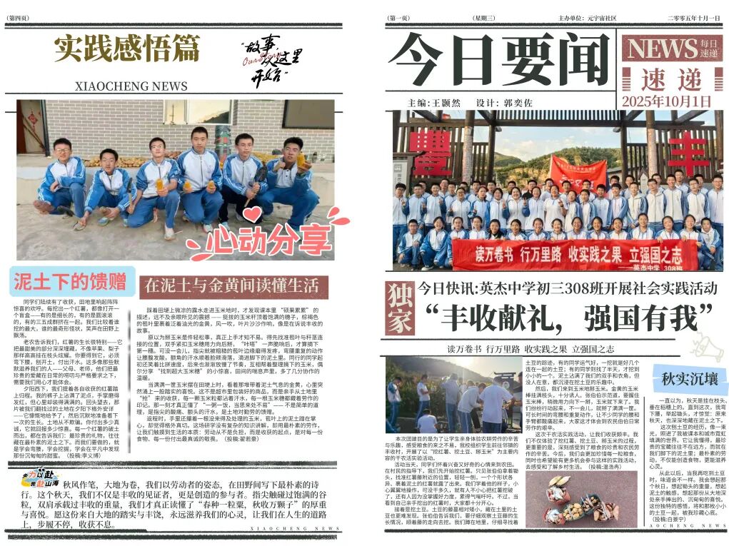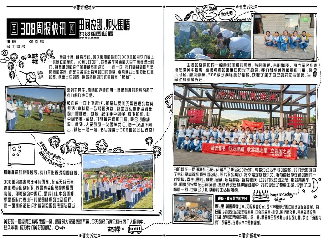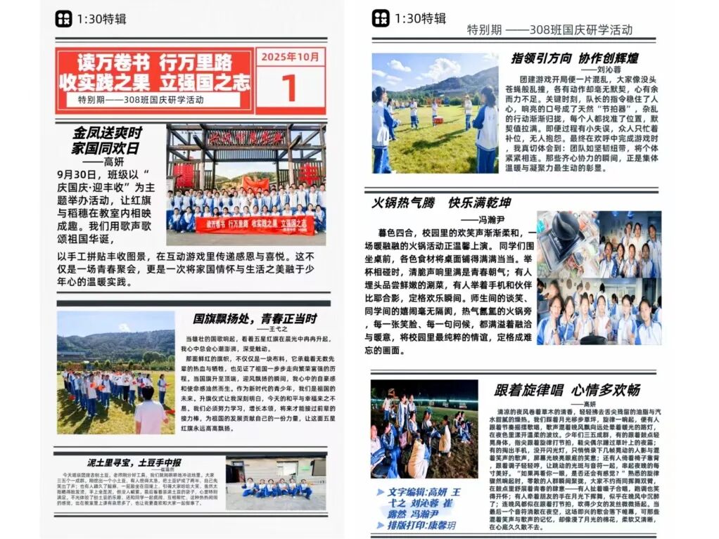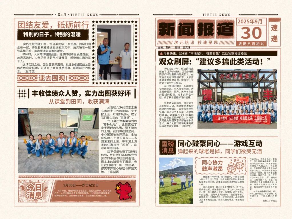 一张张报纸,是研学成果的“存档”,更是青春成长的“见证”。从田间劳作到纸页创作,同学们不仅学会了观察、协作、思考,更懂得了“实践出真知”的道理。这些报纸或许没有精致的印刷,却有着最真挚的情感;或许没有专业的排版,却藏着最鲜活的记忆。我们把这些“研学报纸”汇集起来,不是为了展示成果,而是为了留住这份“从土地里长出来的成长”——愿同学们永远记得:这个国庆,他们在田野里流过的汗、结下的友、悟到的理,都将成为未来路上,最珍贵的“精神粮食”。