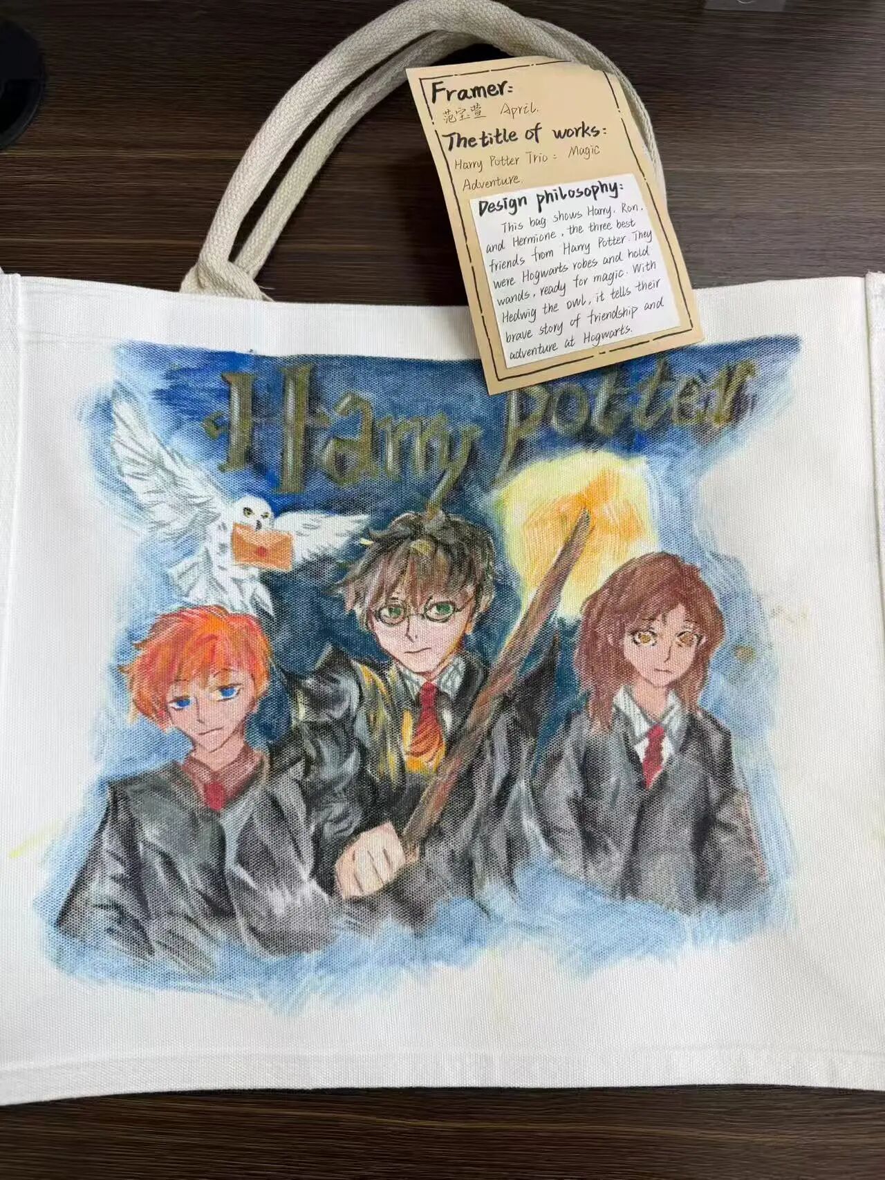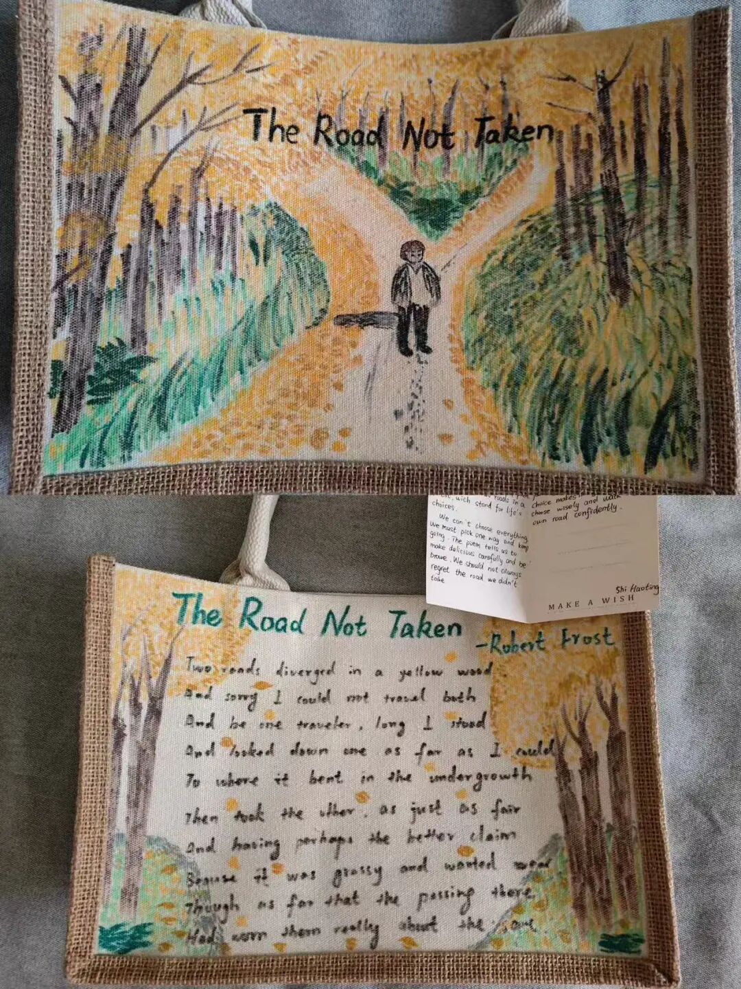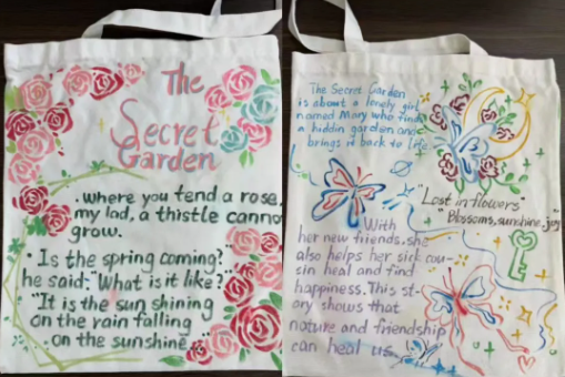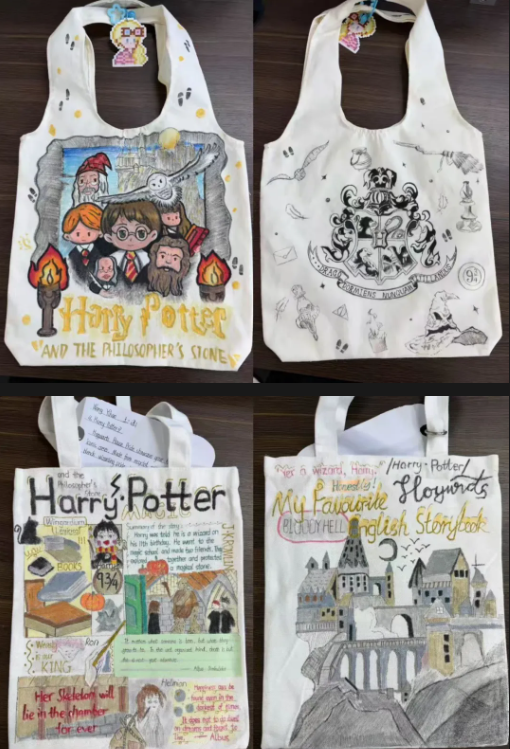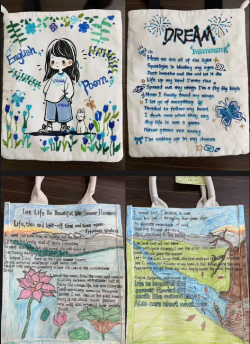 以书为伴,以包为载。同学们将书香、文字与阅读场景融入手绘设计,让帆布包成为行走的“书香小天地”,寓意手拎书香、心藏远方,在阅读中开阔视野、丰盈内心、奔赴更好的自己。