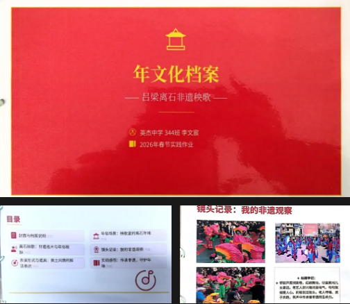 一份份完整规范的文化档案,是同学们深入研究、系统整理的成果。从历史渊源到文化内涵,从传承价值到现实意义,条理清晰、内容详实,体现了英杰学子严谨认真的学习态度与文化探究精神。