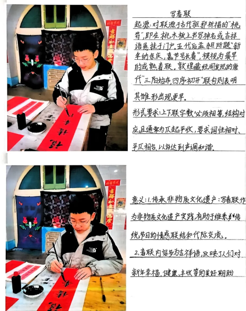初一年级以“寻找非遗文化”为核心,引导同学们走出课堂、深入乡土,解锁家乡非遗的独特魅力。同学们化身“小小文化探寻者”,主动走近吕梁本土民俗,积极参与扭秧歌、转九曲、做花馍、剪纸、写对联等特色活动,用双眼观察、用双手体验、用心感受传承。